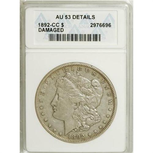 <B>1892-CC $1 --Damaged--ANACS. AU53 Details.</B></I> NGC Census: (22/2934). PCGS Population (46/5139). Mintage: 1,352,000. Numismedia Wsl. Price for NGC/PCGS coin in AU53: $600. (#7214)<BR><BR><b>Shipping:</b> Coins & Currency (<a target="_blank" href="http://www.heritageauctions.com/common/shipping.php">view shipping information</a>)