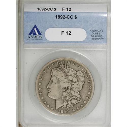 <B>1892-CC $1 F12 ANACS.</B></I> . NGC Census: (10/3253). PCGS Population (14/5716). Mintage: 1,352,000. Numismedia Wsl. Price for NGC/PCGS coin in F12: $183. (#7214)<BR><BR><B>Coin Engraver:</B> George T. Morgan<BR><BR><b>Shipping:</b> Coins & Currency (<a target="_blank" href="http://www.heritageauctions.com/common/shipping.php">view shipping information</a>)
