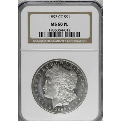 <B>1892-CC $1 MS60 Prooflike NGC.</B></I> As suggested by the grade, the reflective fields show many tiny abrasions that somewhat diminish their sparkle, but the frosted devices are not offensively marked and the overall appeal is greater than the grade would suggest. Great cameo contrast is seen and both sides are colored a pleasing steel-pink.<BR><BR><B>Coin Engraver:</B> George T. Morgan<BR><BR><b>Shipping:</b> Coins & Currency (<a target="_blank" href="http://www.heritageauctions.com/common/shipping.php">view shipping information</a>)
