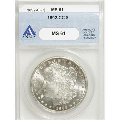 <B>1892-CC $1 MS61 ANACS.</B></I> This popular Carson City dollar is fresh and frosty, with lots of luster and just a bit of light golden tone at the peripheries. There are some contact marks, as is to be expected in this grade, but the overall appeal is still considerable.<BR><BR><B>Coin Engraver:</B> George T. Morgan<BR><BR><b>Shipping:</b> Coins & Currency (<a target="_blank" href="http://www.heritageauctions.com/common/shipping.php">view shipping information</a>)