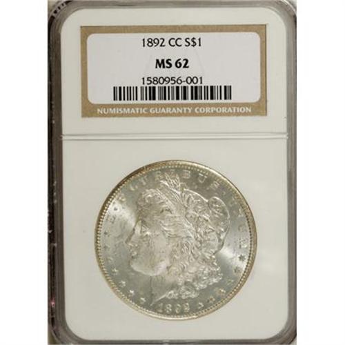 <B>1892-CC $1 MS62 NGC.</B></I> Decisively struck with flashy fields and frosty devices. Only a hint of golden-rose patina graces the margins, and the surfaces are practically untoned otherwise. While the portrait has sustained a number of faint abrasions, this Carson City dollar remains appealing.<BR><BR><B>Coin Engraver:</B> George T. Morgan<BR><BR><b>Shipping:</b> Coins & Currency (<a target="_blank" href="http://www.heritageauctions.com/common/shipping.php">view shipping information</a>\)
