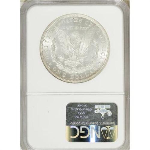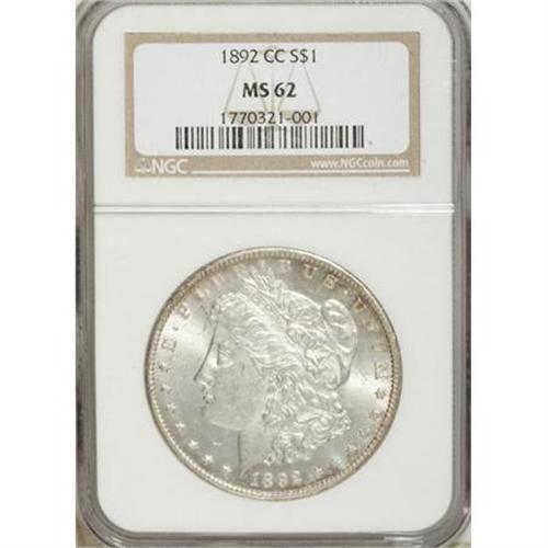 <B>1892-CC $1 MS62 NGC.</B></I> Light peripheral tan toning adorns this lustrous and attentively struck Carson City dollar. The fields are well preserved, and the cheek is unexpectedly smooth for the grade. At least four sets of clash marks are present on both sides.<BR><BR><B>Coin Engraver:</B> George T. Morgan<BR><BR><b>Shipping:</b> Coins & Currency (<a target="_blank" href="http://www.heritageauctions.com/common/shipping.php">view shipping information</a>)