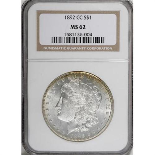 <B>1892-CC $1 MS62 NGC.</B></I> A lustrous scarce-date Carson City dollar that has well preserved fields and a few faint grazes on the cheek. The strike is crisp aside from the hair above the ear. The obverse border features butter-gold toning.<BR><BR><B>Coin Engraver:</B> George T. Morgan<BR><BR><b>Shipping:</b> Coins & Currency (<a target="_blank" href="http://www.heritageauctions.com/common/shipping.php">view shipping information</a>)