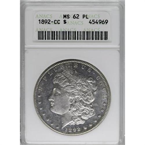 <B>1892-CC $1 MS62 Prooflike ANACS.</B></I> Glassy reflectivity is immediately noticeable in the fields of this attractive Carson City dollar. It is well struck, with sharper-than-average definition noted on both sides, especially in the centers. Minor cloudiness is evident in the fields, and a few small contact marks are found, mostly on the portrait of Liberty. <BR><BR><B>Coin Engraver:</B> George T. Morgan<BR><BR><b>Shipping:</b> Coins & Currency (<a target="_blank" href="http://www.heritageauctions.com/common/shipping.php">view shipping information</a>)