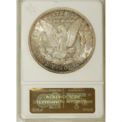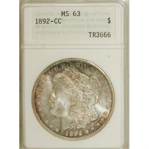 <B>1892-CC $1 MS63 ANACS.</B></I> Golden-rose and ocean-blue invigorate the peripheries of this lustrous and pleasing scarce date Carson City dollar. Housed in an ANA cache holder.<BR><BR><B>Coin Engraver:</B> George T. Morgan<BR><BR><b>Shipping:</b> Coins & Currency (<a target="_blank" href="http://www.heritageauctions.com/common/shipping.php">view shipping information</a>)