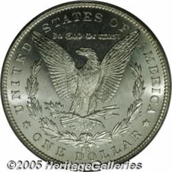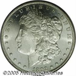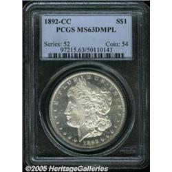 <B>1892-CC<img border='0' src='http://www.heritagecoins.com/images/star.gif' width=10 height=10>$1 MS63 Deep Mirror Prooflike PCGS.</B></I> The deeply mirrored fields of this Silver Dollar are boldly contrasted with the heavily frosted, white devices of this piece. As one would expect from the grade, the obverse surface shows numerous abrasions, none of which are individually distracting.