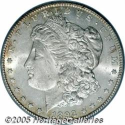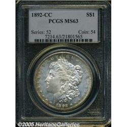 <B>1892-CC<img border='0' src='http://www.heritagecoins.com/images/star.gif' width=10 height=10>$1 MS63 PCGS.</B></I> Frosty-white with golden peripheral color. Typical light abrasions show on the obverse with a much cleaner reverse.
