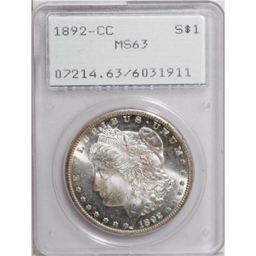 <B>1892-CC $1 MS63 PCGS.</B></I> Dazzling luster illuminates this boldly struck and pleasing Carson City dollar. The obverse has only a few minor grazes, while the reverse is magnificently preserved. Encased in a first generation holder.<BR><BR><B>Coin Engraver:</B> George T. Morgan<BR><BR><b>Shipping:</b> Coins & Currency (<a target="_blank" href="http://www.heritageauctions.com/common/shipping.php">view shipping information</a>\)