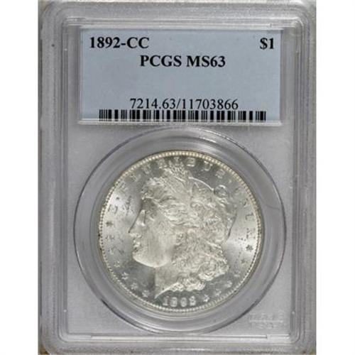 <B>1892-CC $1 MS63 PCGS.</B></I> A die chip rests atop the lower right serif of the 2 in the date. This example is bright and brilliant, with semi-reflective fields. Sharply struck with numerous trivial field marks that limit the grade. A nice Select example of this elusive Carson City issue, which went unrepresented in the great Treasury hoard releases of the 1960s and 1970s.<BR><BR><B>Coin Engraver:</B> George T. Morgan<BR><BR><b>Shipping:</b> Coins & Currency (<a target="_blank" href="http://www.heritageauctions.com/common/shipping.php">view shipping information</a>)