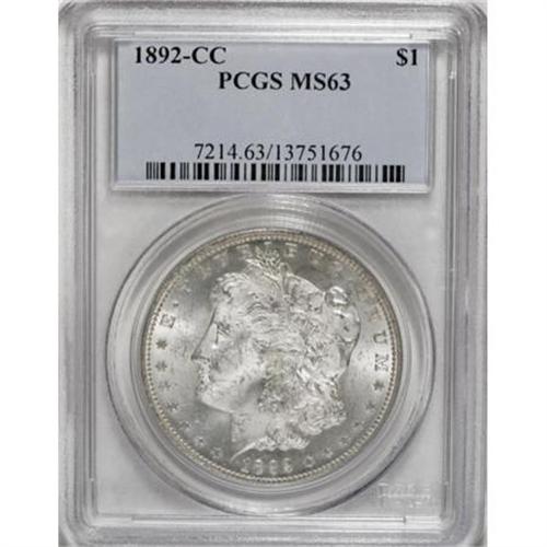 <B>1892-CC $1 MS63 PCGS.</B></I> The 1892-CC dollar tends to be found heavily bagmarked. This Select specimen, while possessing some obverse luster grazes, displays pleasing lustrous surfaces. Untoned, with well struck design elements, except for the usually-seen softness in the centers.<BR><BR><B>Coin Engraver:</B> George T. Morgan<BR><BR><b>Shipping:</b> Coins & Currency (<a target="_blank" href="http://www.heritageauctions.com/common/shipping.php">view shipping information</a>)