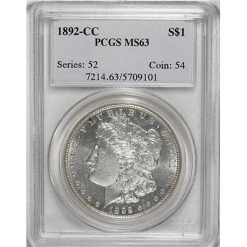 <B>1892-CC $1 MS63 PCGS.</B></I> A solidly struck and appealing Select example that shows semi-prooflike silver-gray surfaces on both sides. The fields have few marks for the grade, though the devices show faint abrasions. A lovely representative of the penultimate Carson City silver dollar issue.<BR><I>From The Mario Eller Collection, Part One.</B></I><BR><BR><B>Coin Engraver:</B> George T. Morgan<BR><BR><b>Shipping:</b> Coins & Currency (<a target="_blank" href="http://www.heritageauctions.com/common/shipping.php">view shipping information</a>)