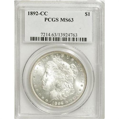 <B>1892-CC $1 MS63 PCGS.</B></I> Silver-gray surfaces yield pleasing luster, and somewhat better defined design elements than most examples of this issue. David Bowers (2006) writes that "Most Mint State 1892-CC dollars are heavily bagmarked and exist in lower grade levels from MS60 to MS62." The reverse of this MS63 example is near pristine, while the obverse reveals a few grade-defining marks.<BR><BR><B>Coin Engraver:</B> George T. Morgan<BR><BR><b>Shipping:</b> Coins & Currency (<a target="_blank" href="http://www.heritageauctions.com/common/shipping.php">view shipping information</a>)
