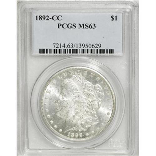 <B>1892-CC $1 MS63 PCGS.</B></I> Frosty luster is the best feature of this Select dollar, which has a very clean reverse and a rather heavily marked obverse. The strike is average for the issue and there is no toning. Extremely lustrous and flashy for the grade. A better date CC dollar.<BR><BR><B>Coin Engraver:</B> George T. Morgan<BR><BR><b>Shipping:</b> Coins & Currency (<a target="_blank" href="http://www.heritageauctions.com/common/shipping.php">view shipping information</a>)