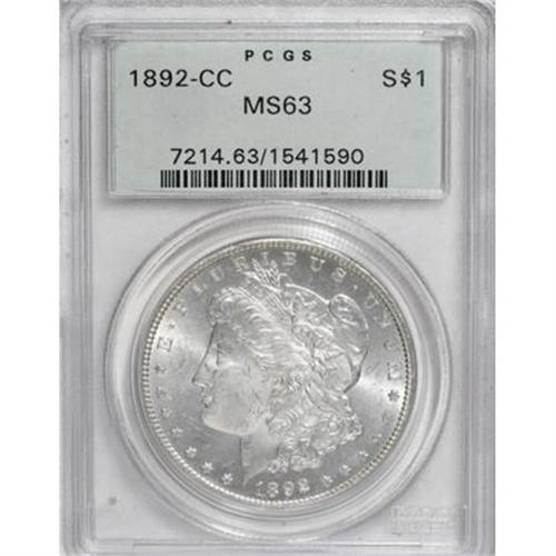 <B>1892-CC $1 MS63 PCGS.</B></I> This lightly toned and lustrous scarce date CC-mint dollar is suitably struck and has a well preserved reverse. Even the cheek has only minor grazes. A light fingerprint fragment is present near the profile. Housed in a green label holder.<BR><BR><B>Coin Engraver:</B> George T. Morgan<BR><BR><b>Shipping:</b> Coins & Currency (<a target="_blank" href="http://www.heritageauctions.com/common/shipping.php">view shipping information</a>)