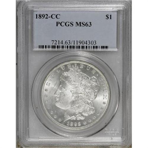 <B>1892-CC $1 MS63 PCGS.</B></I> Solidly struck with strong luster and only a hint of silver-blue toning at the margins. Though a few light abrasions are noted on the portrait, the overall visual appeal is excellent for the grade.<BR><BR><B>Coin Engraver:</B> George T. Morgan<BR><BR><b>Shipping:</b> Coins & Currency (<a target="_blank" href="http://www.heritageauctions.com/common/shipping.php">view shipping information</a>)