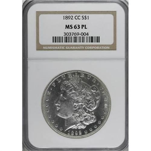 <B>1892-CC $1 MS63 Prooflike NGC.</B></I> This satiny, brilliant, and intricately struck Select Prooflike dollar has clean fields and a smooth cheek. A high-end example of this scarcer Carson City emission.<BR><BR><B>Coin Engraver:</B> George T. Morgan<BR><BR><b>Shipping:</b> Coins & Currency (<a target="_blank" href="http://www.heritageauctions.com/common/shipping.php">view shipping information</a>)