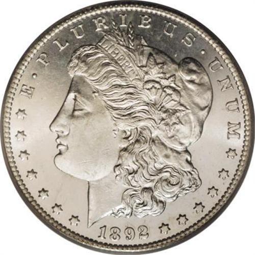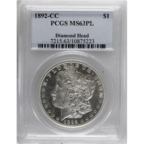 <B>1892-CC $1 MS63 Prooflike PCGS.</B></I> Ex: Diamond Head. VAM-4. The mintmark is repunched. A stone-white and meticulously struck better date CC-mint dollar. The fields are impressively mirrored, and marks are uncommonly trivial for the MS63 grade. An excellent candidate for the Carson City connoisseur.<BR><I>From the Diamond Head Collection.</B></I><BR><BR><B>Coin Engraver:</B> George T. Morgan<BR><BR><b>Shipping:</b> Coins & Currency (<a target="_blank" href="http://www.heritageauctions.com/common/shipping.php">view shipping information</a>)