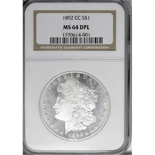 <B>1892-CC $1 MS64 Deep Prooflike NGC.</B></I> A delightful near-Gem specimen with deeply mirrored fields around lustrous devices on both sides. This piece has brilliant, untoned silver surfaces and exhibits a high degree of aesthetic desirability that will appeal to nearly any collector. Census: 17 in 64, 1 finer (10/07).<BR><BR><b>Shipping:</b> Coins & Currency (<a target="_blank" href="http://www.heritageauctions.com/common/shipping.php">view shipping information</a>)