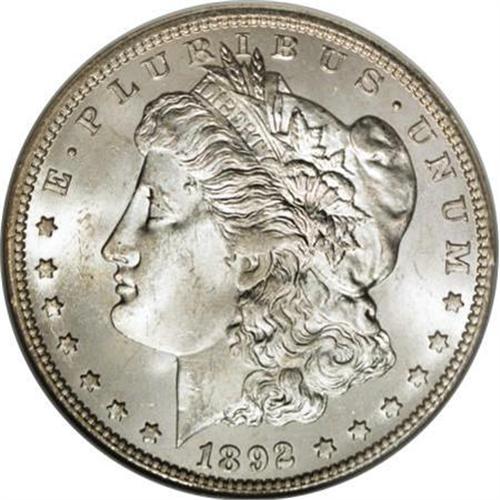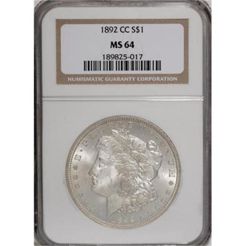 <B>1892-CC $1 MS64 NGC.</B></I> Pleasing luster radiates from both sides of this near-Gem Carson City representative. While the coin seems untoned at first glance, magnification reveals hints of light gold color in the left obverse field. Generally well struck, with a few minor grade-consistent marks.<BR><BR><B>Coin Engraver:</B> George T. Morgan<BR><BR><b>Shipping:</b> Coins & Currency (<a target="_blank" href="http://www.heritageauctions.com/common/shipping.php">view shipping information</a>)
