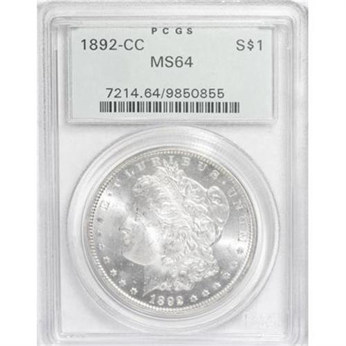 <B>1892-CC $1 MS64 PCGS.</B></I> David Bowers (2005) notes of the 1892-CC dollar: "Year in and year out this coin has been in great demand. MS63 and MS64 offer excellent acquisition possibilities ... ." The near-Gem offered in this lot displays glowing luster emanating from untoned surfaces. Fairly sharp definition is visible on the design elements, and just a few minor obverse marks limit the grade. Housed in a green-label holder.<BR><BR><b>Shipping:</b> Coins & Currency (<a target="_blank" href="http://www.heritageauctions.com/common/shipping.php">view shipping information</a>)