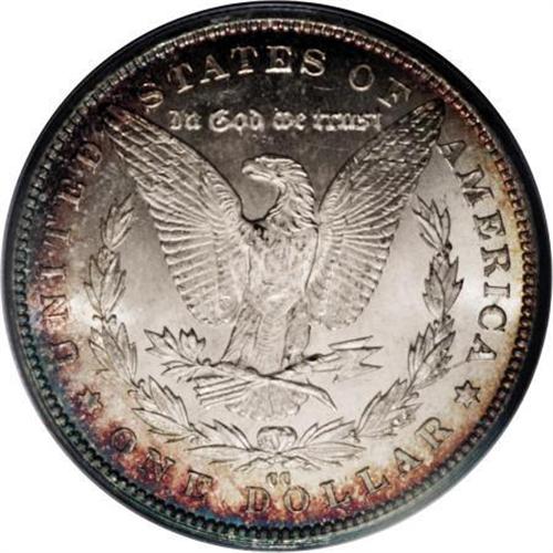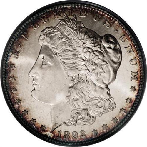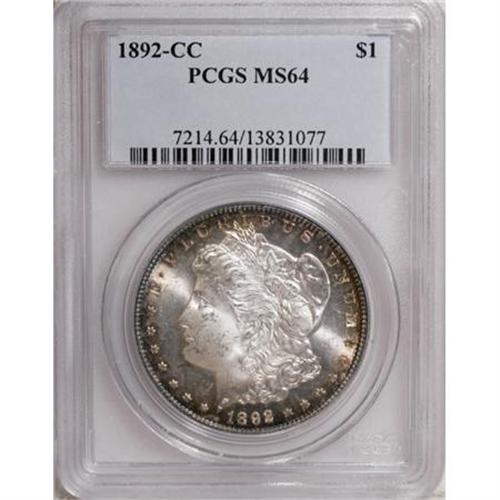 <B>1892-CC $1 MS64 PCGS.</B></I> Beautiful ruby-red, golden-brown, and cobalt-blue toning adorns the margins of this crisply struck and highly lustrous Carson City dollar. The fields are well preserved, and the cheek has only moderate grazes. Only a single 1892-CC dollar emerged from the GSA hoard, which ensures the scarcity of this popular issue.<BR><BR><B>Coin Engraver:</B> George T. Morgan<BR><BR><b>Shipping:</b> Coins & Currency (<a target="_blank" href="http://www.heritageauctions.com/common/shipping.php">view shipping information</a>\)
