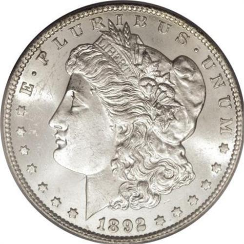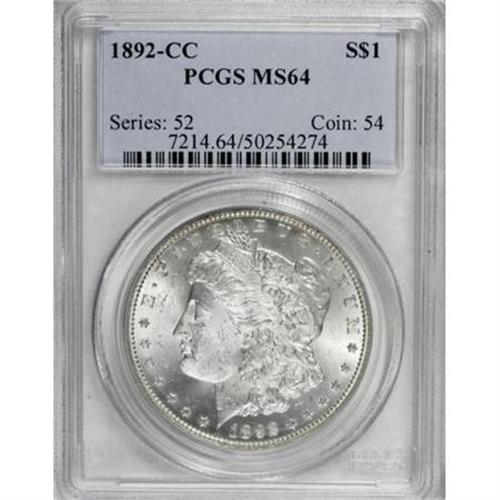 <B>1892-CC $1 MS64 PCGS.</B></I> One of the more popular dates in the Carson City series, although not in the front rank of rarities. The meager mintage of only 1.35 million coins was likely further reduced by Pittman Act meltings. This silvery and lustrous piece is well produced, although it does show light roller marks at the center obverse under magnification. Contact marks are at a minimum. This piece also shows a nifty die break/fill on the lower loop of the 2 in the date that joins, on the right, stars 13-11 and 9-8 with the (UNU)M, and on the left with the other date digits, the rim, and stars 2-4. A nice piece for the grade, and one that should see a good premium as a variety.<BR><BR><B>Coin Engraver:</B> George T. Morgan<BR><BR><b>Shipping:</b> Coins & Currency (<a target="_blank" href="http://www.heritageauctions.com/common/shipping.php">view shipping information</a>)