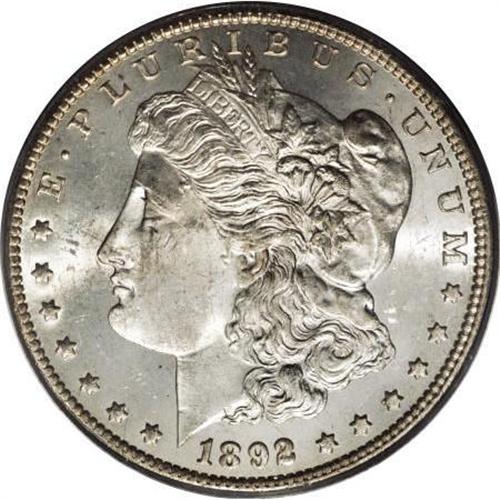 <B>1892-CC $1 MS64 PCGS.</B></I> This near-Gem '92-CC exhibits strong definition, including the hair at Liberty's ear and the eagle's breast feathers. The silvery surfaces give off a somewhat prooflike appearance. While most Mint State coins of this issue are heavily bagmarked (David Bowers, 2006), this example possesses just a few inoffensive luster grazes.<BR><BR><B>Coin Engraver:</B> George T. Morgan<BR><BR><b>Shipping:</b> Coins & Currency (<a target="_blank" href="http://www.heritageauctions.com/common/shipping.php">view shipping information</a>)