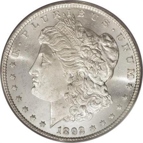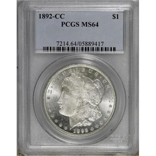 <B>1892-CC $1 MS64 PCGS.</B></I> An elegant representative of the penultimate Carson City Morgan dollar issue, boldly impressed with a hint of rose patina over the center of the richly frosted portrait. Both sides have strong, swirling luster with just a hint of haze over the fields. Despite a mintage of over 1.3 million pieces, the 1892-CC is more elusive than some of its lower-mintage counterparts, owing to its comparative under-representation in the GSA hoard.<BR><BR><B>Coin Engraver:</B> George T. Morgan<BR><BR><b>Shipping:</b> Coins & Currency (<a target="_blank" href="http://www.heritageauctions.com/common/shipping.php">view shipping information</a>)