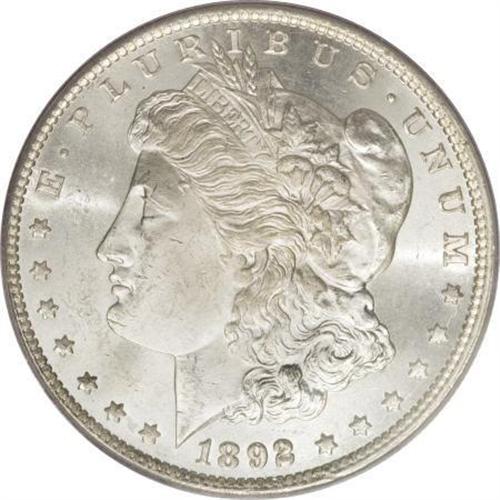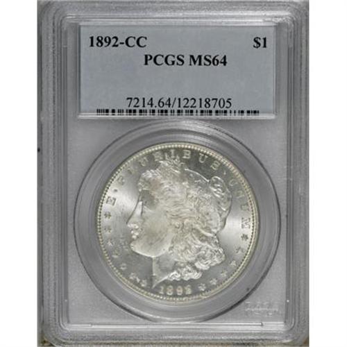 <B>1892-CC $1 MS64 PCGS.</B></I> The vibrantly lustrous silver-gray surfaces of this Carson City beauty show only a hint of haze over parts of the obverse fields. The thick frost on the reverse devices has a faint echo on the highpoints of the obverse. Though the portrait shows a few small marks, its overall visual appeal is impressive for the MS64 grade.<BR><BR><B>Coin Engraver:</B> George T. Morgan<BR><BR><b>Shipping:</b> Coins & Currency (<a target="_blank" href="http://www.heritageauctions.com/common/shipping.php">view shipping information</a>)