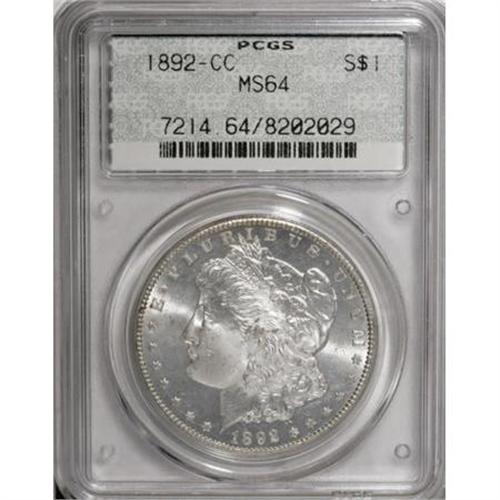 <B>1892-CC $1 MS64 PCGS.</B></I> This lustrous near-Gem has beautifully smooth fields, and is brilliant aside from a couple of wisps of steel-gray on the reverse. A good strike despite incompleteness near Liberty's ear. A better Carson City issue. Certified in a circa-1990 doily label holder.<BR><BR><B>Coin Engraver:</B> George T. Morgan<BR><BR><b>Shipping:</b> Coins & Currency (<a target="_blank" href="http://www.heritageauctions.com/common/shipping.php">view shipping information</a>)