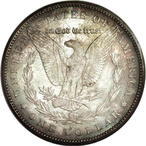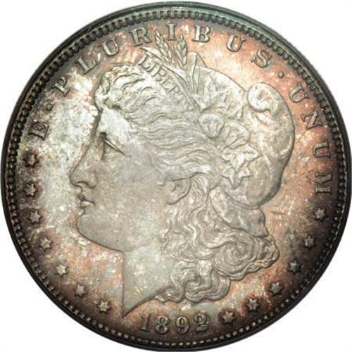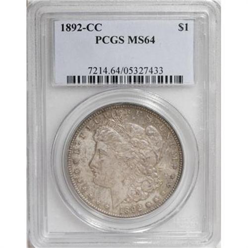 <B>1892-CC $1 MS64 PCGS.</B></I> This near-Gem is a pleasingly preserved representative of its late-date Carson City issue, boldly impressed with soft, pleasing luster. The rich patina that graces each side is this Choice coin's prime attribute. Rich silver-blue, cerulean, peach, and sage shadings embrace the entirety of the surfaces. Pleasingly preserved with incredible eye appeal.<BR><BR><B>Coin Engraver:</B> George T. Morgan<BR><BR><b>Shipping:</b> Coins & Currency (<a target="_blank" href="http://www.heritageauctions.com/common/shipping.php">view shipping information</a>)