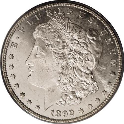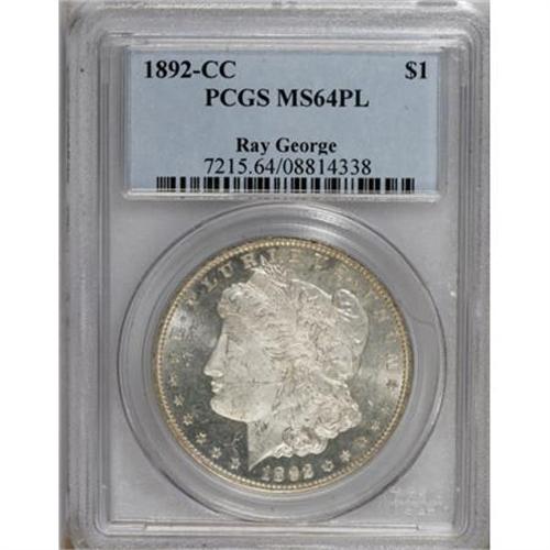 <B>1892-CC $1 MS64 Prooflike PCGS.</B></I> Ex: Ray George. A charming Prooflike example from the penultimate CC-mint Morgan dollar issue. A liberal coating of icy mint frost covers the devices, while the brilliantly mirrored fields lack any trace of toning and possess only minor abrasions. Population: 74 in 64 Prooflike, 10 finer (8/07). <BR><BR><B>Coin Engraver:</B> George T. Morgan<BR><BR><b>Shipping:</b> Coins & Currency (<a target="_blank" href="http://www.heritageauctions.com/common/shipping.php">view shipping information</a>)