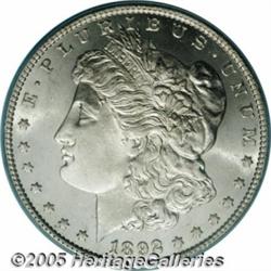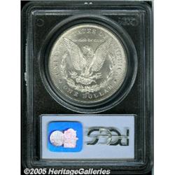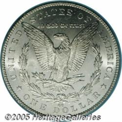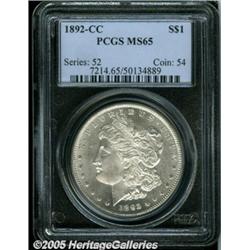 <B>1892-CC<img border='0' src='http://www.heritagecoins.com/images/star.gif' width=10 height=10>$1 MS65 PCGS.</B></I> The entire bottom of the final digit in the date is filled by a die chip. This is a delightful Gem quality example with frosty silver luster and excellent eye appeal. The surfaces are fully brilliant without toning. It is sharply struck with reflective fields. Only a few finer examples of this date have been certified by PCGS. Population: 205 in 65, 19 finer (2/05).