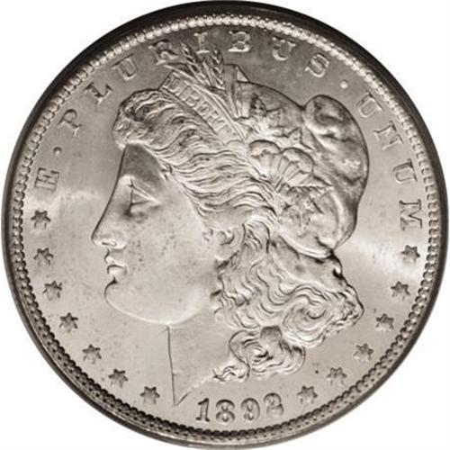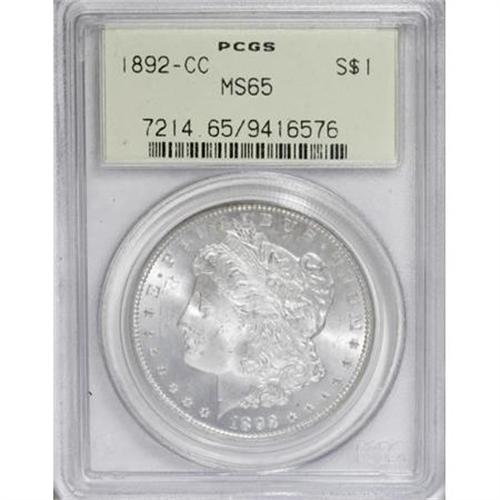 <B>1892-CC $1 MS65 PCGS.</B></I> Some of the Carson City dollars from the early 1880s are relatively common and make good type coins, both from the viewpoint of availability as well as exceptional eye appeal. However, the 1892-CC is not one of the more common Carson City dollars. Few Gems are known, and those tend to be pricey. This is a brilliant coin that is reasonably well struck, save for the hair over the ear and some of the eagle's breast feathers. The fields are bright and have a tendency toward satiny, and there are very few abrasions on either side of this lovely coin. <BR><BR><B>Coin Engraver:</B> George T. Morgan<BR><BR><b>Shipping:</b> Coins & Currency (<a target="_blank" href="http://www.heritageauctions.com/common/shipping.php">view shipping information</a>\)