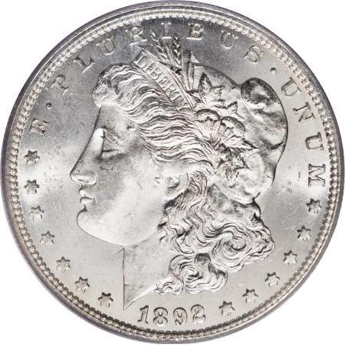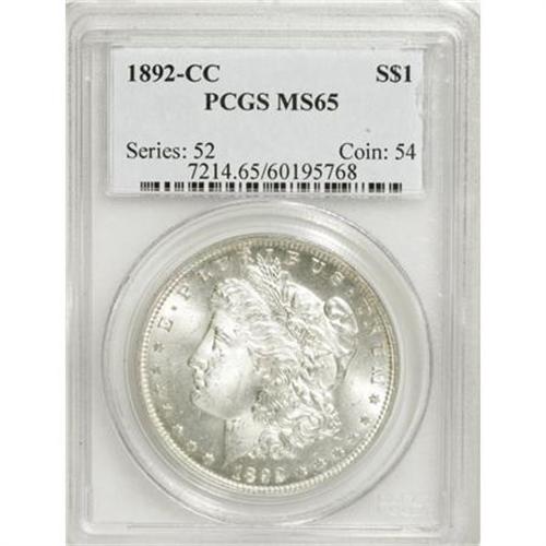 <B>1892-CC $1 MS65 PCGS.</B></I> A brilliant and unmarked Gem that has only minor inexactness of strike at the centers. Both sides show overlapping sets of clashmarks. The 1892-CC was absent from the GSA holdings, although a number of Treasury bags were undoubtedly disbursed during the 1950s.<BR><BR><B>Coin Engraver:</B> George T. Morgan<BR><BR><b>Shipping:</b> Coins & Currency (<a target="_blank" href="http://www.heritageauctions.com/common/shipping.php">view shipping information</a>)
