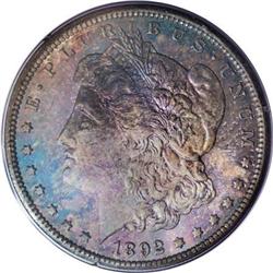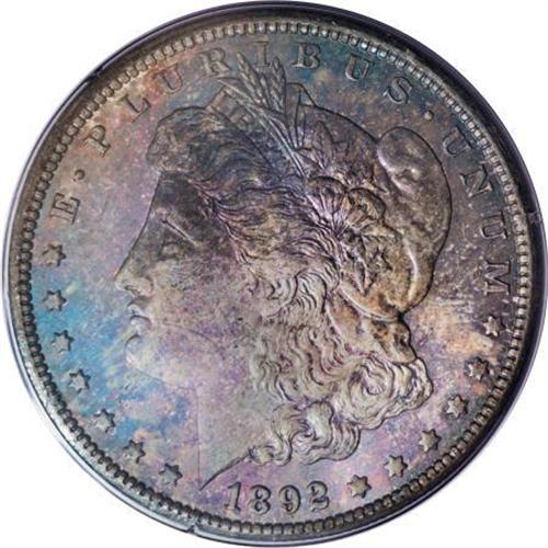 <B>1892-CC $1 MS65 PCGS.</B></I> A mixture of deep gray, rose, and turquoise-blue toning is seen over each side of this Gem Morgan dollar. Vibrant luster illuminates the carefully preserved surfaces. A boldly struck example of this elusive issue, which did not surface in quantity from the GSA hoard, unlike its Carson City brethren from the early to mid-1880s. Encapsulated in a first-generation PCGS holder. <BR><BR><B>Coin Engraver:</B> George T. Morgan<BR><BR><b>Shipping:</b> Coins & Currency (<a target="_blank" href="http://www.heritageauctions.com/common/shipping.php">view shipping information</a>)