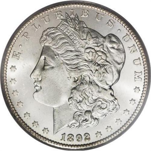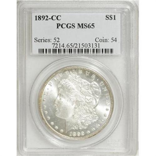 <B>1892-CC $1 MS65 PCGS.</B></I> The 1892-CC is a coin that is in great demand by collectors of Carson City dollars as well as Morgan dollar collectors in general. It is surprisingly elusive in Gem condition in spite of a mintage of more than 1.3 million pieces. This example is sharply struck and well balanced on each side with brilliant, highly lustrous surfaces. <BR><I>From The Jimmy G. PCGS Registry Collection of Morgan Dollars with Varieties.</B></I><BR><BR><B>Coin Engraver:</B> George T. Morgan<BR><BR><b>Shipping:</b> Coins & Currency (<a target="_blank" href="http://www.heritageauctions.com/common/shipping.php">view shipping information</a>)