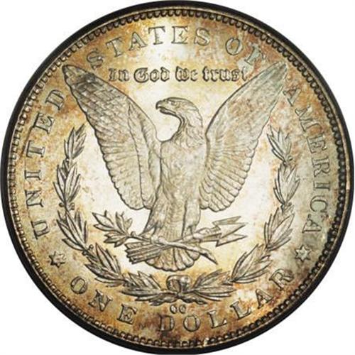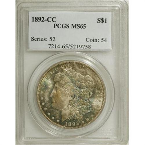 <B>1892-CC $1 MS65 PCGS.</B></I> Splashes of blue-green and yellow-gold cover the obverse, while the reverse is mostly yellow-gold and light gray. Generally well struck, though the centers are a bit soft, as usually seen on this issue. Nicely preserved on both sides on what is typically a heavily bagmarked issue.<BR><BR><B>Coin Engraver:</B> George T. Morgan<BR><BR><b>Shipping:</b> Coins & Currency (<a target="_blank" href="http://www.heritageauctions.com/common/shipping.php">view shipping information</a>)