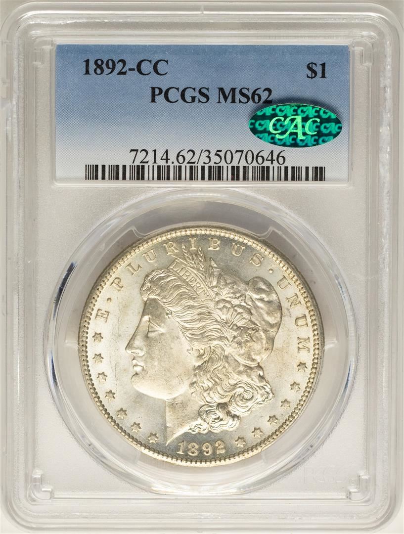 One 1892-CC $1 Morgan Silver Dollar Coin PCGS MS62 CAC. PCGS Graded.
