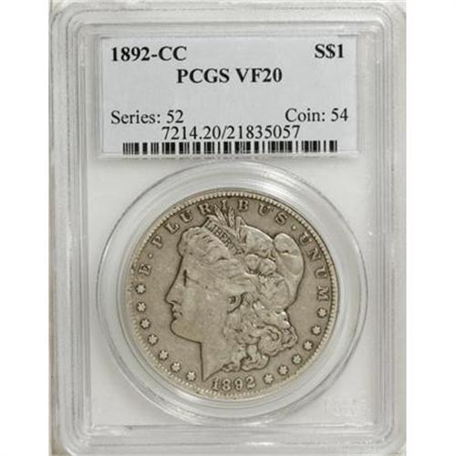 <B>1892-CC $1 VF20 PCGS.</B></I> PCGS Population (17/5440). NGC Census: (6/3113). Mintage: 1,352,000. Numismedia Wsl. Price for NGC/PCGS coin in VF20: $250. (#7214)<BR><BR><B>Coin Engraver:</B> George T. Morgan<BR><BR><b>Shipping:</b> Coins & Currency (<a target="_blank" href="http://www.heritageauctions.com/common/shipping.php">view shipping information</a>\)