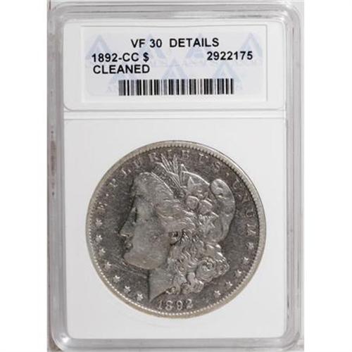 <B>1892-CC $1 --Cleaned--ANACS. VF30 Details.</B></I> NGC Census: (38/3042). PCGS Population (24/5349). Mintage: 1,352,000. Numismedia Wsl. Price for NGC/PCGS coin in VF30: $255. (#7214)<BR><BR><B>Coin Engraver:</B> George T. Morgan<BR><BR><b>Shipping:</b> Coins & Currency (<a target="_blank" href="http://www.heritageauctions.com/common/shipping.php">view shipping information</a>)