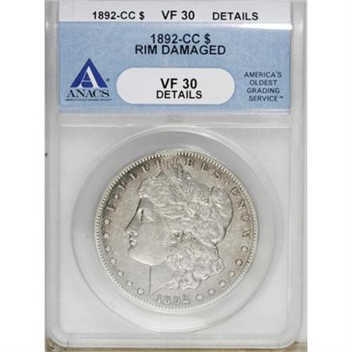 <B>1892-CC $1 --Rim Damaged--ANACS. VF30 Details.</B></I> NGC Census: (17/3150). PCGS Population (25/5550). Mintage: 1,352,000. Numismedia Wsl. Price for NGC/PCGS coin in VF30: $320. (#7214)<BR><BR><B>Coin Engraver:</B> George T. Morgan<BR><BR><b>Shipping:</b> Coins & Currency (<a target="_blank" href="http://www.heritageauctions.com/common/shipping.php">view shipping information</a>)