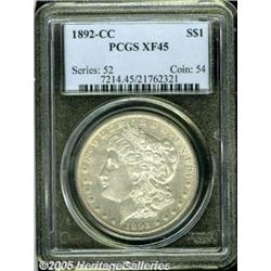 <B>1892-CC<img border='0' src='http://www.heritagecoins.com/images/star.gif' width=10 height=10>$1 XF45 PCGS.</B></I> This is a pleasing Carson City dollar, untoned and well detailed, with complete definition on Liberty's hair, and on the eagle's wing feathers. There are numerous fine hairlines on each side, and a few noticeable abrasions on the reverse.