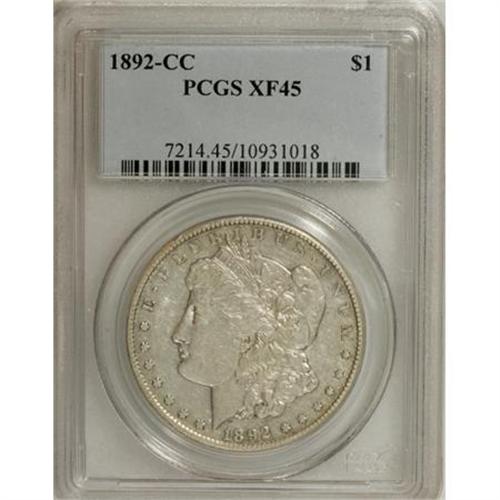 <B>1892-CC $1 XF45 PCGS.</B></I> PCGS Population (55/5337). NGC Census: (41/3043). Mintage: 1,352,000. Numismedia Wsl. Price for NGC/PCGS coin in XF45: $479. (#7214)<BR><BR><B>Coin Engraver:</B> George T. Morgan<BR><BR><b>Shipping:</b> Coins & Currency (<a target="_blank" href="http://www.heritageauctions.com/common/shipping.php">view shipping information</a>)