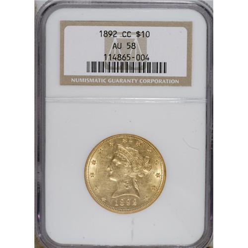 <B>1892-CC $10 AU58 NGC.</B></I> The intensely lustrous straw-gold surfaces have a bright, frosty sheen over both sides. Well struck with minimal highpoint wear and a few scattered abrasions. Wispy hairlines are noted in the obverse and reverse fields. Census: 90 in 58, 33 finer (3/07).<BR><BR><b>Shipping:</b> Coins & Currency (<a target="_blank" href="http://www.heritageauctions.com/common/shipping.php">view shipping information</a>)