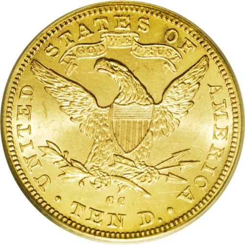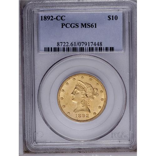 <B>1892-CC<$10> MS61 PCGS.</B></I> Under a loupe, myriad small abrasions can be seen, along with a single straight scrape across the cheek of Liberty. The coin, nonetheless, appears to have been downgraded too severely, as the brilliant luster, attractive color, and crisp strike are all attractive and desirable. Clash marks are seen in the center reverse. Population: 4 in 61, 12 finer (3/06). <BR><BR><B>Important notice:</B> Heritage usually auctions material at the rate of 200-250 lots per hour. On some occasions eBay Live bid software or the Internet may not be able to keep up with the pace of the auction. We recommend placing a realistic absentee bid now as insurance to avoid disappointment. Occasionally the auctioneer may eliminate or reject an eBay Live bid, and the auctioneer may also reopen a lot after the close of the eBay live bidding (usually because we missed an audience bid), and may reject your bid even if it shows you as the winning bidder. By bidding via eBay Live, you agree that Heritage may award the lot to another bidder at its sole discretion under the circumstances described above or any other reasonable circumstances. Since eBay bids are not shown to us until we open the lot on the floor, we treat those bids just like floor bids. In most cases the floor responds before the eBay bid is presented to us, due to Internet lag time, so for consistency we have made it a policy that floor bids are always considered first over tie eBay live bids. Also please note that all Heritage lots purchased through eBay Live carry a 20% Buyer's Premium. Please make sure you read the Terms and Conditions before you bid. This lot is being auctioned in conjunction with a live floor auction by Heritage Galleries & Auctioneers. All final auction and invoice information will be supplied by Heritage Galleries & Auctioneers, and all other information should be considered preliminary. Lot:4029 <BR><BR><B>Winning Notification and Billing:</B> After the FINAL session in this auction is complete, Heritage will send e-mail and snail mail invoices. This process normally takes several days. All final auction and invoice information will be supplied by Heritage Galleries & Auctioneers, and all other information should be considered preliminary. <BR><BR>This auction will be conducted on a live auction floor and over the Internet through eBay Live. If you choose to place an absentee bid, please take a moment to <font color='#0000ff'><u><a href='http://pages.ebay.com/liveauctions/help/before/laabsentee.html'>learn how eBay Live absentee bidding works</a></u></font><font color='#000000'>