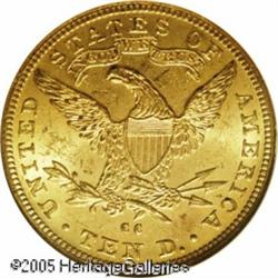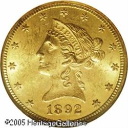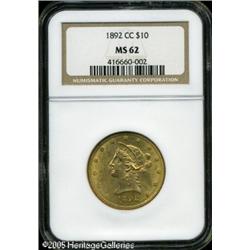 <B>1892-CC $10 MS62 NGC.</B></I> Sharply struck with deep golden luster and frosty surfaces. A couple small marks at Liberty's chin are the only serious distractions. Although 40,000 of these were struck, few have survived in Mint State grades. Population: 6 in 62, 2 finer (1/05). Lot:8797