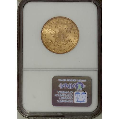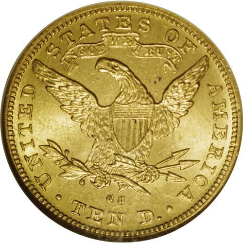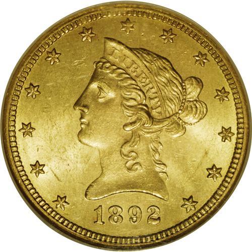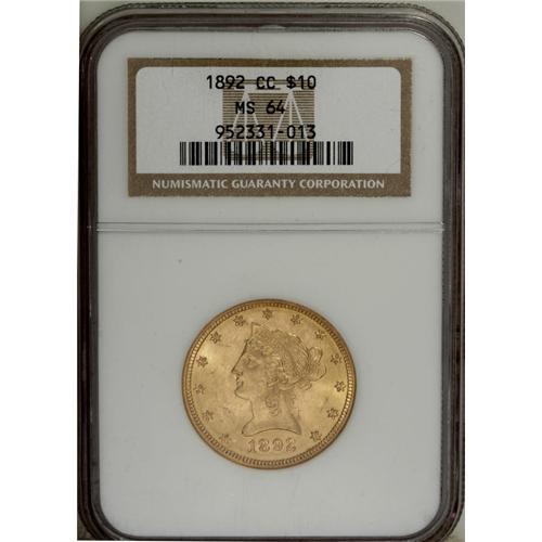 <B>1892-CC $10 MS64 NGC.</B></I> The mintage of this issue was 40,000 coins, making it the second largest production of any eagle from the Carson City Mint. Like many issues from Carson City and other mints, the survival rate is ultimately more important than the initial mintage. Nearly all surviving examples of this issue are circulated, indicating that these pieces must have been released into commerce at the time they were produced, although Rusty Goe reported that perhaps 95% of the mintage was exported. This seems unlikely, as many such coins would have been returned to American collectors in recent years.<BR> Consider the combined populations of NGC and PCGS, with a total of 675 examples certified, but only 52 of those in MS60 or finer grades. This example is tied for the finest certified, with just five MS64 examples graded by both of these companies combined. Only two others have been certified as MS63, both by PCGS, and the balance are in still lower grades. According to Jeff Garrett and Ron Guth, the average certified grade of this issue is just AU50, with just 7% of the population achieving Mint State grades. For comparison purposes, they note that more than half of all certified 1891-CC eagles grade MS60 or finer.<BR> This impressive piece, with its highly lustrous and frosty yellow-gold surfaces, has exceptional aesthetic appeal. The surfaces approach perfection with only the slightest blemishes on either side. The upper portion of the reverse shows slight doubling, especially at the tops of the letters in the motto. Census: 3 in 64, 0 finer (1/07).<BR><BR><b>Shipping:</b> Coins & Currency (<a target="_blank" href="http://www.heritageauctions.com/common/shipping.php">view shipping information</a>)