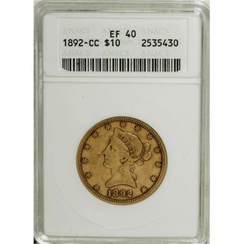 <B>1892-CC $10 XF40 ANACS.</B></I> NGC Census: (22/335). PCGS Population (39/251). Mintage: 40,000. Numismedia Wsl. Price for NGC/PCGS coin in XF40: $420. (#8722)<BR><BR><B>Coin Engraver:</B> Christian Gobrecht<BR><BR><b>Shipping:</b> Coins & Currency (<a target="_blank" href="http://www.heritageauctions.com/common/shipping.php">view shipping information</a>)