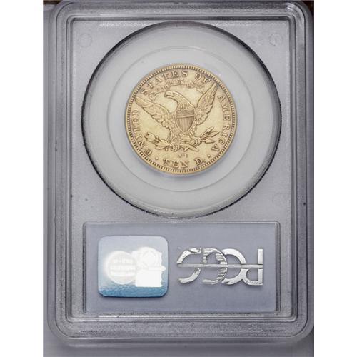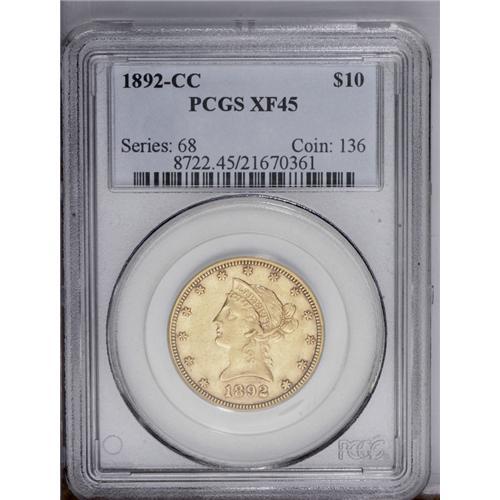 <B>1892-CC $10 XF45 PCGS.</B></I> IN GOD WE TRUST and STATES OF are nicely die doubled on this low mintage Carson City eagle. Luster is substantial for the grade, and the light golden-brown surfaces are only moderately subdued by wispy slide marks.